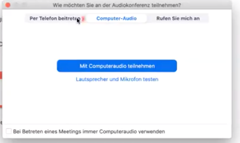 - Mit Computeraudio teilnehmen (= Kamera und Lautsprecher am PC verwenden)