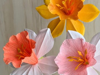 In diesem Kurs gestalten wir wunderschöne Narzissen aus hochwertigem Floristen-Krepppapier in verschiedenen Farben und Texturen – schöne Frühblüher, die dauerhaft Freude bereiten. Schritt für Schritt lernen Sie die Technik zum Schneiden, Formen und Gestalten der zarten Blüten, es sind keine Vorkenntnisse erforderlich. Am Kursende nehmen Sie Ihre eigenen, liebevoll gestalteten Papierblumen mit nach Hause – perfekt als Frühlingsdekoration oder Geschenk. Bitte eine kleine Schere mitbringen. Alle Materialien wie Krepppapier, Draht und Schablonen sind im
