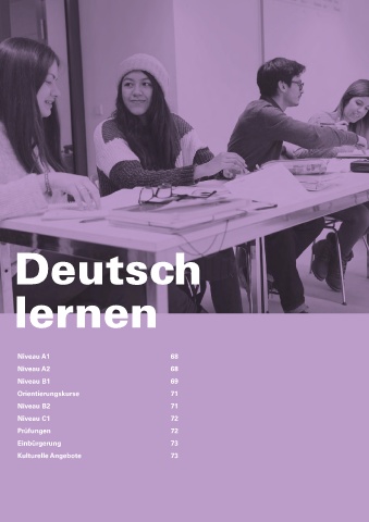 Deutsch lernen Niveau A1 68 Niveau A2 68 Niveau B1 69 Orientierungskurse 71 Niveau B2 71 Niveau C1 72 Prüfungen 72 Einbürgerung 73 Kulturelle Angebote 73