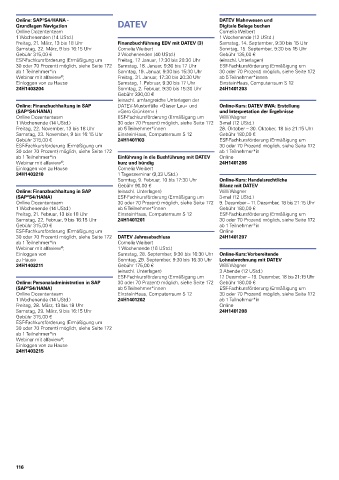 Freitag, 21. März, 13 bis 18 Uhr Finanzbuchführung EDV mit DATEV (3) Samstag, 14. September, 9:30 bis 15 Uhr