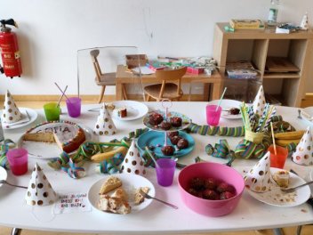 Geburtstagskuchen, Snacks und Getränke werden von den Familien selber mitgebracht, es gibt einen großen Tisch.