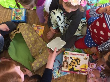 Geburtstagskuchen, Snacks und Getränke werden von den Familien selber mitgebracht, es gibt einen großen Tisch.