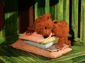 Der Herbst ist fast vorbei. Mit seinem Wind zerzaust er nochmal die Bäume, zupft und rupft die letzten braunen Blätter von den Ästen und wirbelt sie durch die Luft. Und eines, das landet auf der Nase vom Bär. Der kommt gerade aus dem Wald und hat einen schweren Bauch vom Fressen – die letzten Nüsse und Pilze. Und schwere Beine hat er auch – so müde vor dem Winterschlaf. Langsam stapft er zu seiner Bärenhöhle. Er freut sich auf sein weiches Winterschlafbett. Auf der wird er sich ausstrecken, sich räkeln und zusammenrollen. Und dann wird er federleicht auf ihr ins Land der Träume segeln. Es ist soweit. Er plumpst auf sein Bett, streckt sich, räkelt sich und rollt sich zusammen. Doch was ist das? Da pikst und kneift etwas! Der Bär schüttelt sein Bett aus. Und? Hat nichts geholfen, kein Rütteln und kein Schütteln! So kann der Bär nicht schlafen. Und wenn er nicht schlafen kann, kriegt er schlechte Laune. Wie soll das bloß weitergehen?